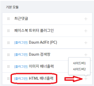 9) 사이드바 클릭하시면 기본 모듈에 HTML 배너출력이 있습니다.