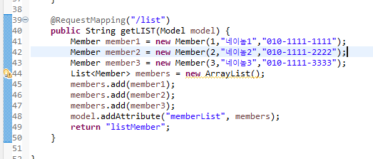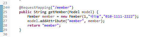 Member 객체에 값을 넣고 member.html로 객체를 model을 통해 전달합니다.