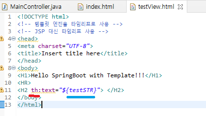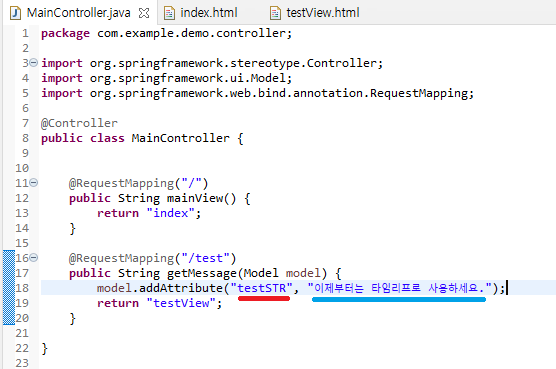 Model을 이용해 testSTR이란 변수로 메시지를 전달합니다.