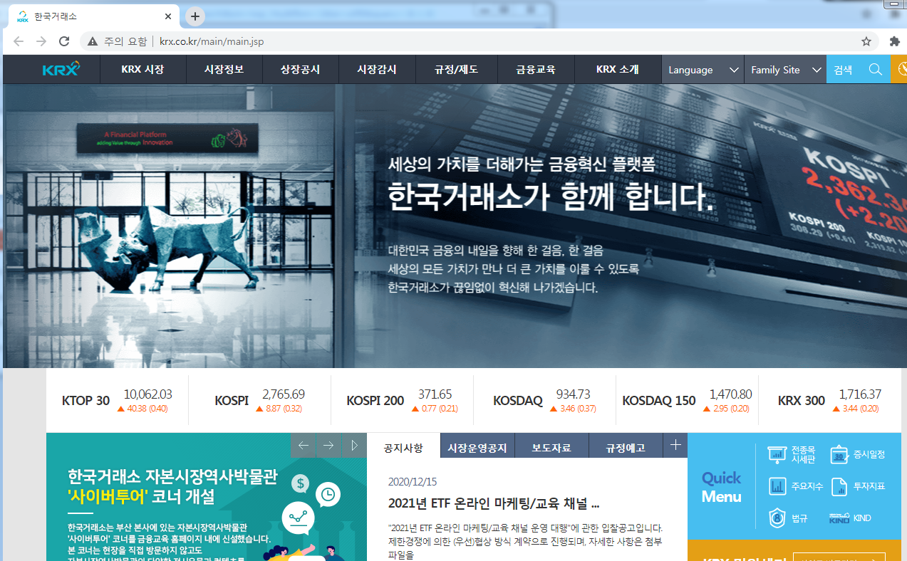 사람들이 모여 증권을 사고 파는 거래시장입니다.