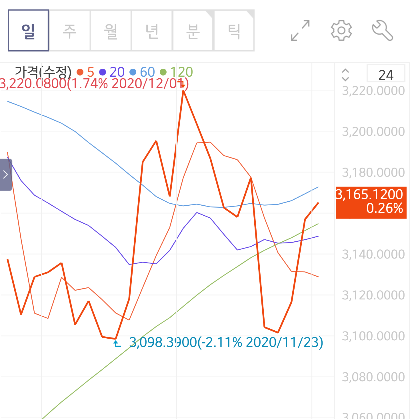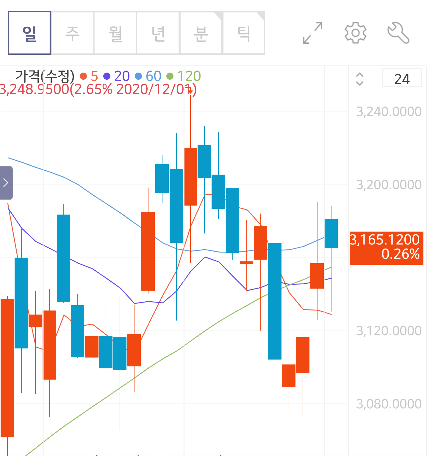 봉차트에서 기간별로 차트를 볼수 있게 되어 있습니다.