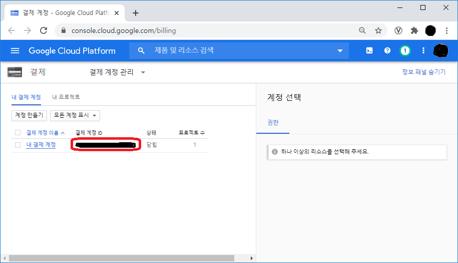Billing Account ID 는 아래 빨간색 클릭하시면 나옵니다.