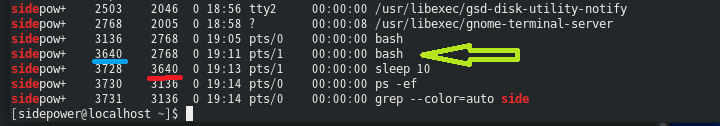 파란색줄 3640이 PID로 지정되어 있고 프로세스명으로 bash 로 표기(녹색 화살표) 되어 있습니다.