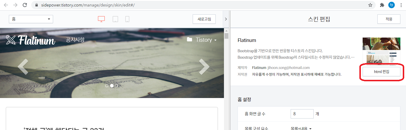 다시 티스토리로 갑니다. 관리자 메뉴 - 스킨편집 클릭해주세요.
