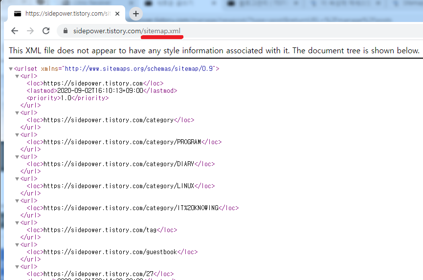 블로그 주소 뒤로 /sitemap.xml 인터넷 주소창에 입력해서 보시면 아래처럼 만들어진게 보일거에요.