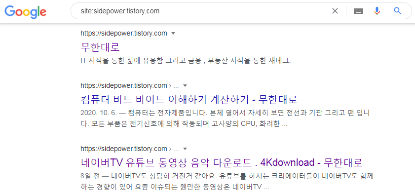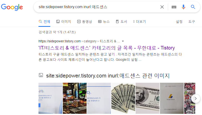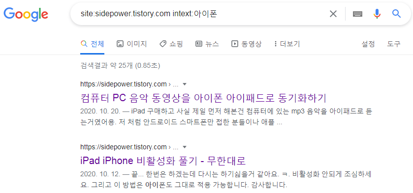 특정 사이트 검색 . 제 티스토리를 예로 검색했습니다.