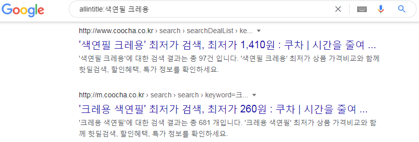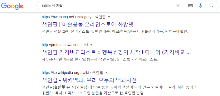 | allintitle: | intitle과 동일하게 페이지 제목에서만 검색하는데 여러 단어가 모두 일치하는 검색. |