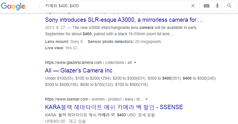 카메라 가격이 400달러에서 450달러 사이의 모든 금액이 검색됩니다.
