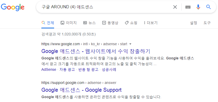 구글 단어로부터 4단어 안에 애드센스 단어가 있는 것 검색