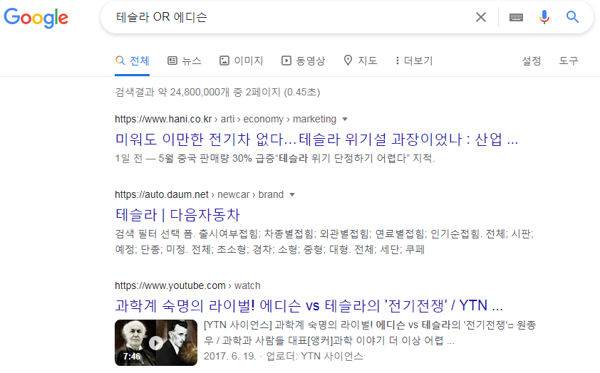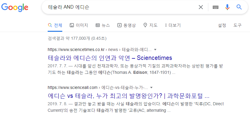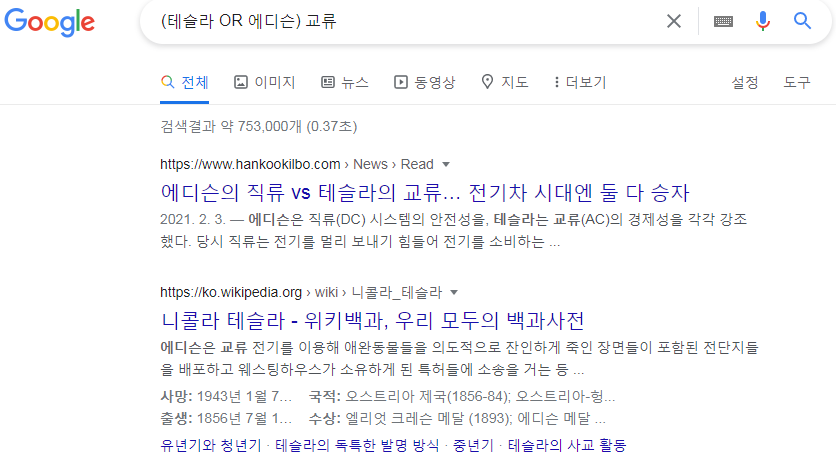 테슬라와 에디슨 OR 검색 먼저 수행한 후에 결과에서