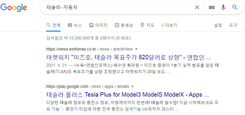 테슬라 검색 결과에서 자동차 단어를 제외한 글이 검색됩니다.