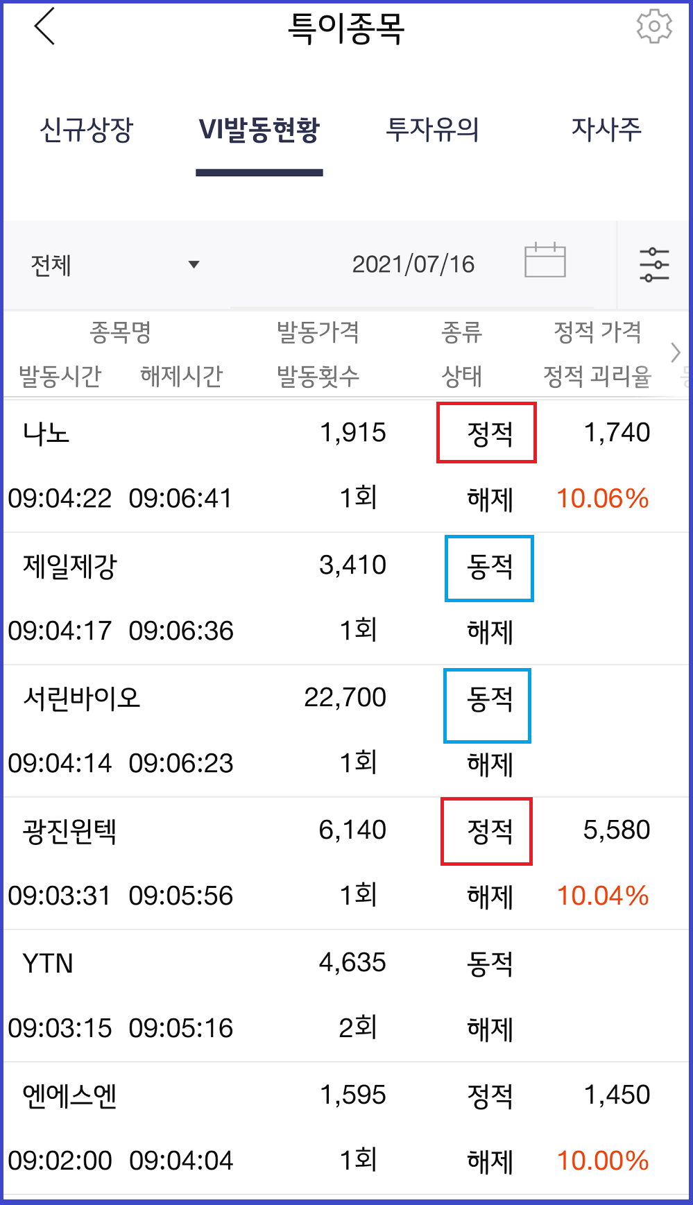 VI 현황을 보시면 동적보다는 대부분 정적VI가 많이 보일 거예요.