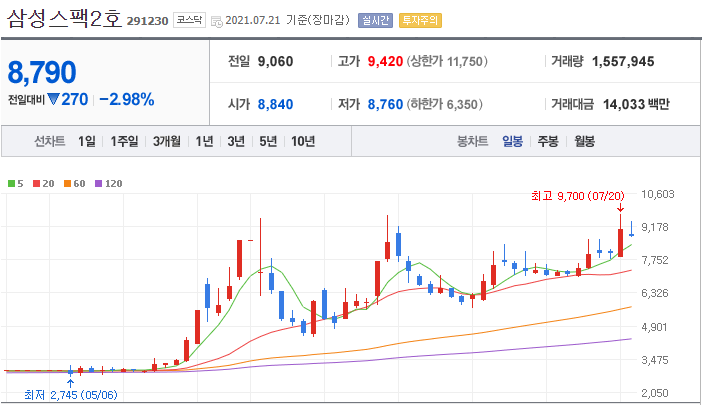 삼성스팩2호만 9,000원대고 나머지는 대부분 2,000원대입니다.