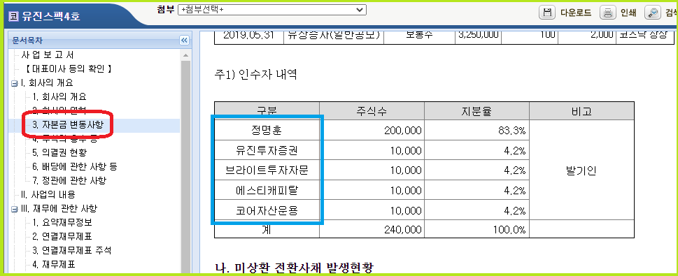 사업보고서와 주요사항보고서(회사합병결정) 를 보면 될 거예요.