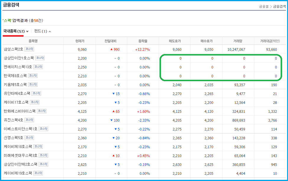 아래 우리나라 스팩주를 보면 57개가 있네요.