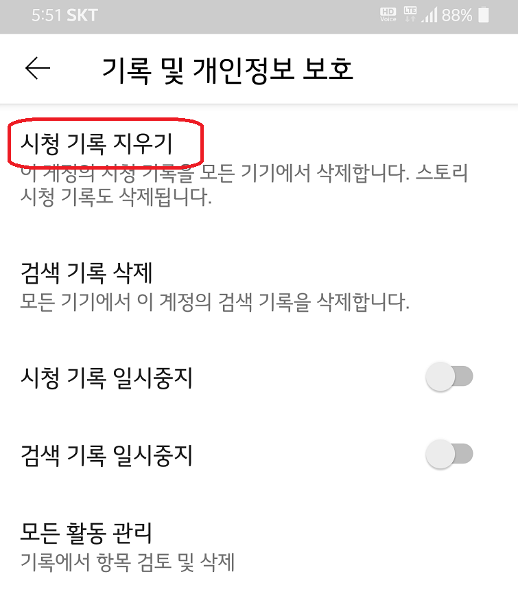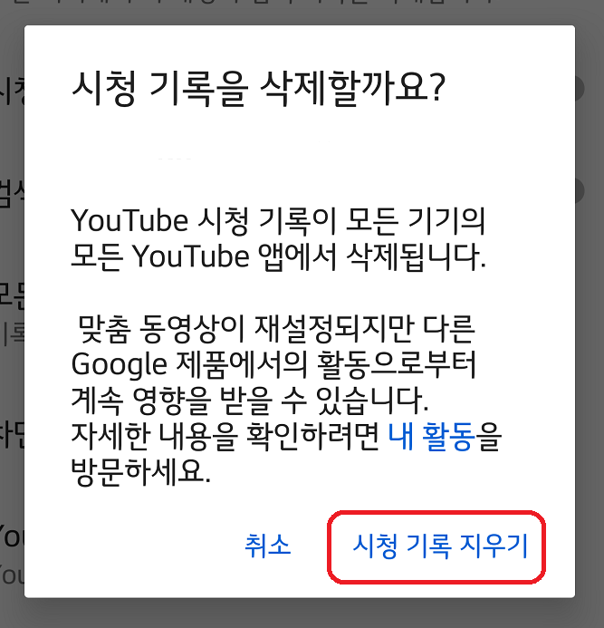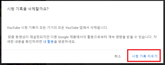 시청 기록 지우기 클릭하세요.