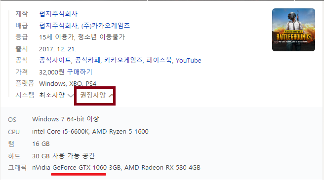 아래는 배틀그라인드 게임의 권장사양입니다.