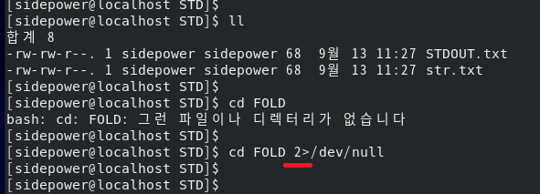 이 표준에러 2를 보지 않아도 되면 위 처럼 리다이렉션 > 를 이용해 /dev/null 로 보냅니다.