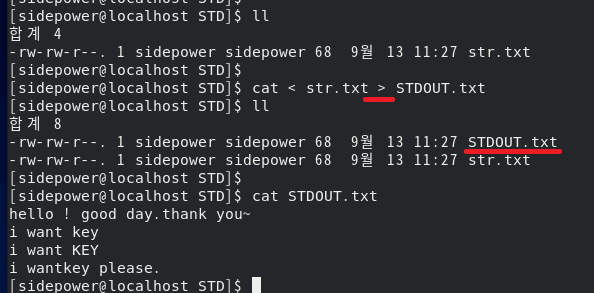 위는 cat 을 통해 표준입력 < 과 표준출력 > 을 같이 이용하는 예입니다.
