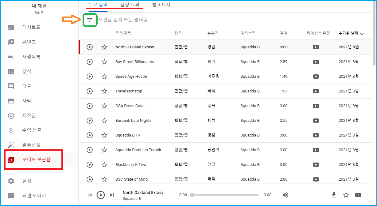 왼쪽 「오디오 보관함」 클릭하세요.