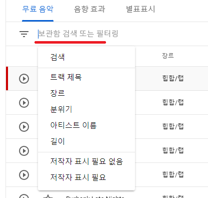역시 무료 음악과 동일하게 필터링 옵션 메뉴로 검색할 수 있어요.