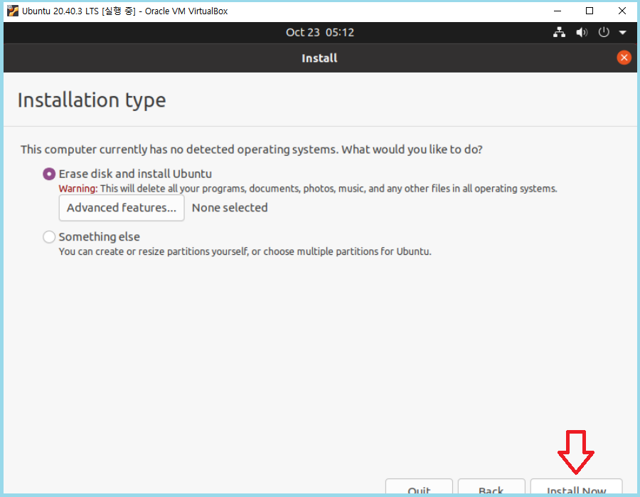 Erase disk and install Ubuntu (디스크 지우고 우분투) 설치 선택해주세요.