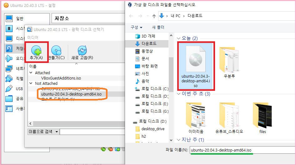「추가」 클릭해서 다운로드 받은 ISO 파일을 선택해주세요.