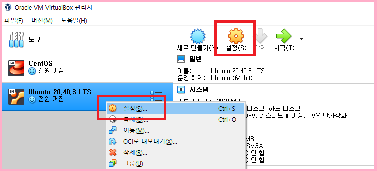 왼쪽 가상 머신에서 마우스 오른 버튼 클릭에 있는 설정