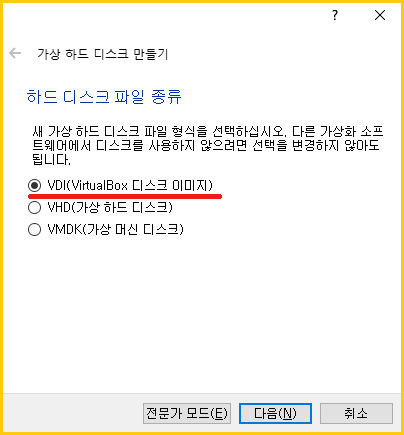 VDI (VirtualBox 디스크 이미지) 선택합니다.
