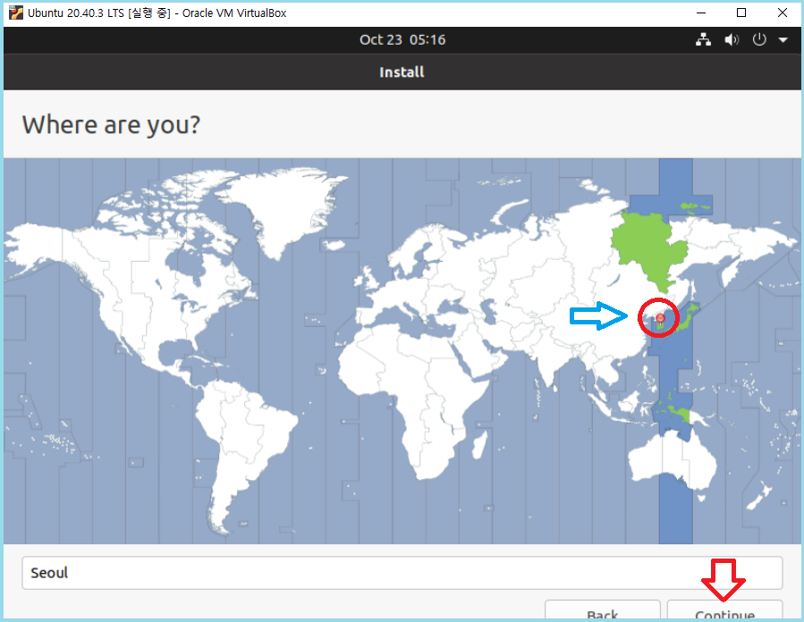 시간대 설정을 위해 지도에서 Seoul 서울 선택하세요.