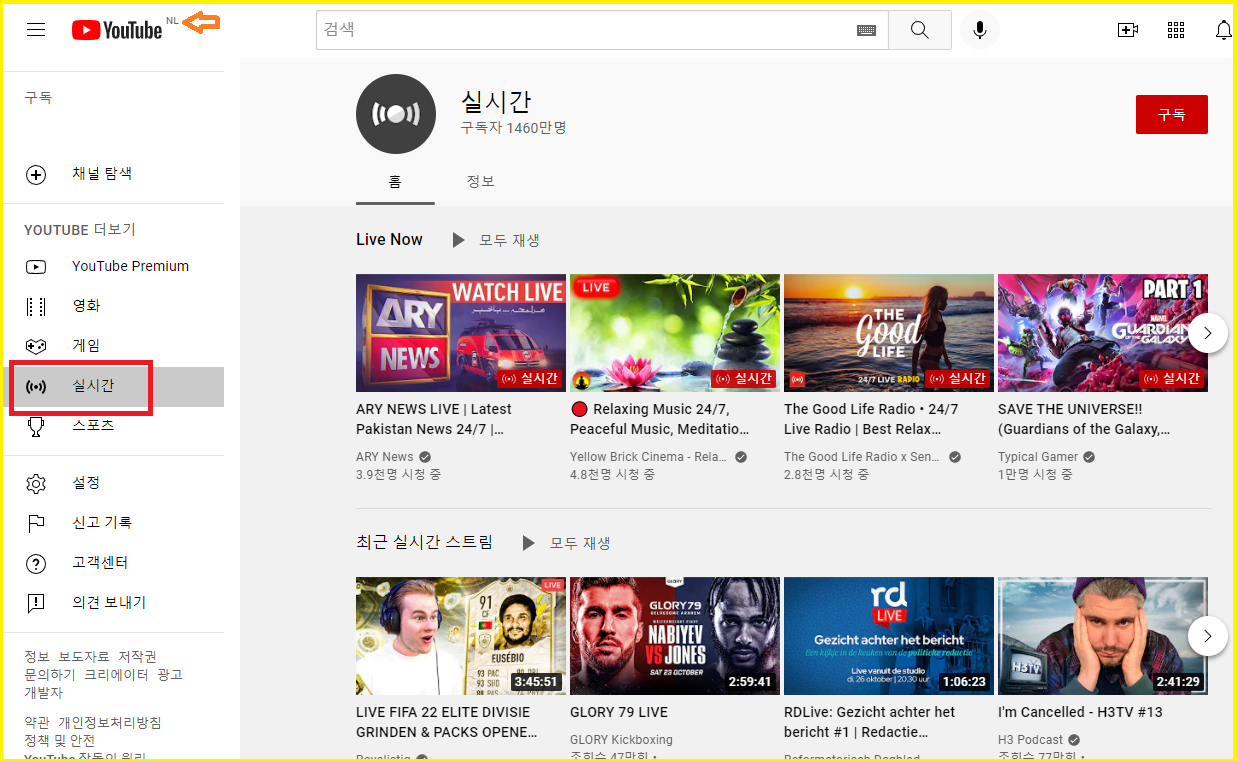 왼쪽 유튜브 로고 위에 작은 글씨로 네덜란드를 표시하는 'NL'로 되어 있어요.