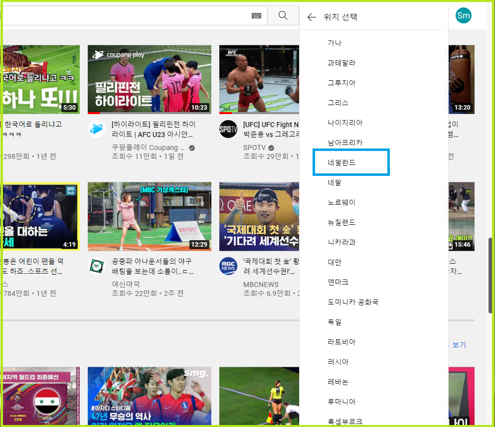 네덜란드 선택 후에 유튜브 사이트가 리플래쉬되고