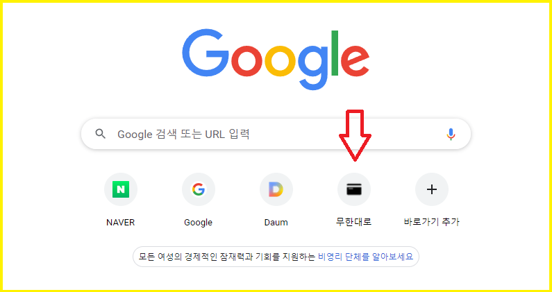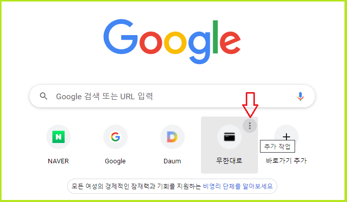 크롬 첫페이지의 무한대로 바로가기 아이콘을 마우스 왼쪽 버튼으로 클릭한 상태에서