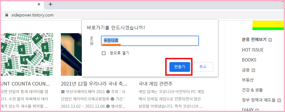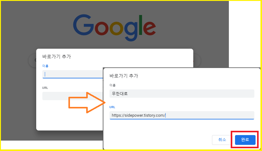 바로가기 만들 적절한 이름과 URL을 입력하세요.