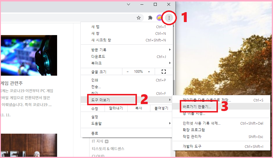 메뉴 : 크롬 설정(점 3개) → 도구 더보기 → 바로가기 만들기