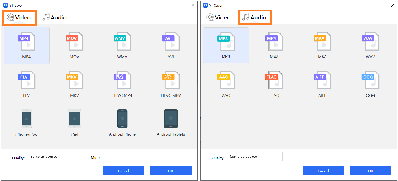 대표적으로 동영상은 MP4로 음악은 MP3로 지정하시면 됩니다.