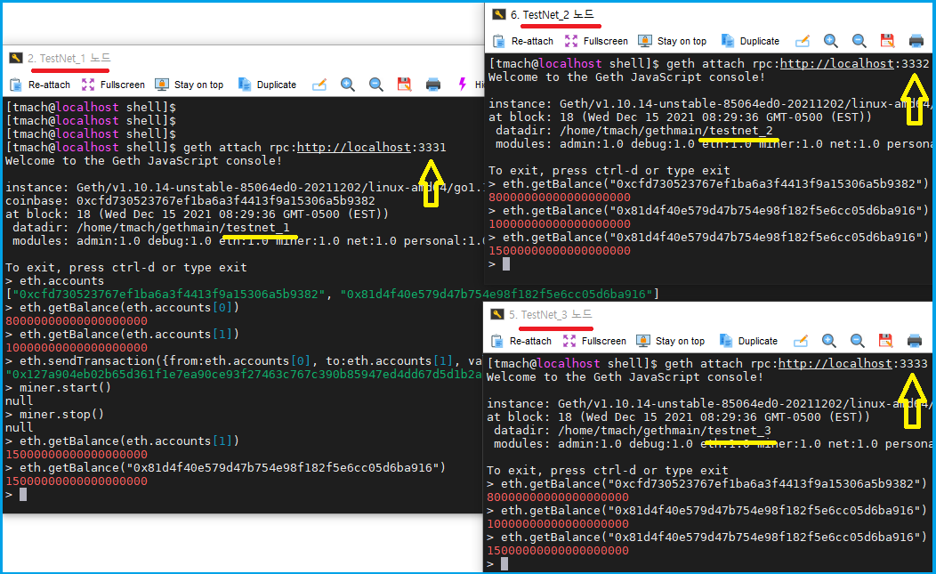 ◆ TestNet_1 [tmach@localhost shell]$ geth attach rpc:http://localhost:3331 Welcome to the Geth JavaScript console! instance: Geth/v1.10.14-unstable-85064ed0-20211202/linux-amd64/go1.17.3 coinbase: 0xcfd730523767ef1ba6a3f4413f9a15306a5b9382 at block: 18 (Wed Dec 15 2021 08:29:36 GMT-0500 (EST)) datadir: /home/tmach/gethmain/testnet_1 modules: admin:1.0 debug:1.0 eth:1.0 miner:1.0 net:1.0 personal:1.0 rpc:1.0 txpool:1.0 web3:1.0 To exit, press ctrl-d or type exit > eth.accounts ["0xcfd730523767ef1ba6a3f4413f9a15306a5b9382", "0x81d4f40e579d47b754e98f182f5e6cc05d6ba916"] > eth.getBalance(eth.accounts[0]) 80000000000000000000 > eth.getBalance(eth.accounts[1]) 10000000000000000000 ♣ eth.accounts[1] 계정(지갑)으로 5ether를 송금합니다. > eth.sendTransaction({from:eth.accounts[0], to:eth.accounts[1], value:web3.toWei(5)}) "0x127a904eb02b65d361f1e7ea90ce93f27463c767c390b85947ed4dd67d5d1b2a" > miner.start() null > miner.stop() null ♣ 기존 10ether에서 15ether로 정상 송금되었습니다. > eth.getBalance(eth.accounts[1]) 15000000000000000000 ♣ 주소로 잔액확인 > eth.getBalance("0x81d4f40e579d47b754e98f182f5e6cc05d6ba916") 15000000000000000000 > ◆ TestNet_2 [tmach@localhost shell]$ geth attach rpc:http://localhost:3332 Welcome to the Geth JavaScript console! instance: Geth/v1.10.14-unstable-85064ed0-20211202/linux-amd64/go1.17.3 at block: 18 (Wed Dec 15 2021 08:29:36 GMT-0500 (EST)) datadir: /home/tmach/gethmain/testnet_2 modules: admin:1.0 debug:1.0 eth:1.0 miner:1.0 net:1.0 personal:1.0 rpc:1.0 txpool:1.0 web3:1.0 To exit, press ctrl-d or type exit > eth.getBalance("0xcfd730523767ef1ba6a3f4413f9a15306a5b9382") 80000000000000000000 > eth.getBalance("0x81d4f40e579d47b754e98f182f5e6cc05d6ba916") 10000000000000000000 ♣ TestNet_1의 5ether 송금 처리 후에 재확인으로 15ether가 확인됩니다. > eth.getBalance("0x81d4f40e579d47b754e98f182f5e6cc05d6ba916") 15000000000000000000 > ◆ TestNet_3 [tmach@localhost shell]$ geth attach rpc:http://localhost:3333 Welcome to the Geth JavaScript console! instance: Geth/v1.10.14-unstable-85064ed0-20211202/linux-amd64/go1.17.3 at block: 18 (Wed Dec 15 2021 08:29:36 GMT-0500 (EST)) datadir: /home/tmach/gethmain/testnet_3 modules: admin:1.0 debug:1.0 eth:1.0 miner:1.0 net:1.0 personal:1.0 rpc:1.0 txpool:1.0 web3:1.0 To exit, press ctrl-d or type exit > eth.getBalance("0xcfd730523767ef1ba6a3f4413f9a15306a5b9382") 80000000000000000000 > eth.getBalance("0x81d4f40e579d47b754e98f182f5e6cc05d6ba916") 10000000000000000000 ♣ TestNet_1의 5ether 송금 처리 후에 재확인으로 15ether가 확인됩니다. > eth.getBalance("0x81d4f40e579d47b754e98f182f5e6cc05d6ba916") 15000000000000000000 > |