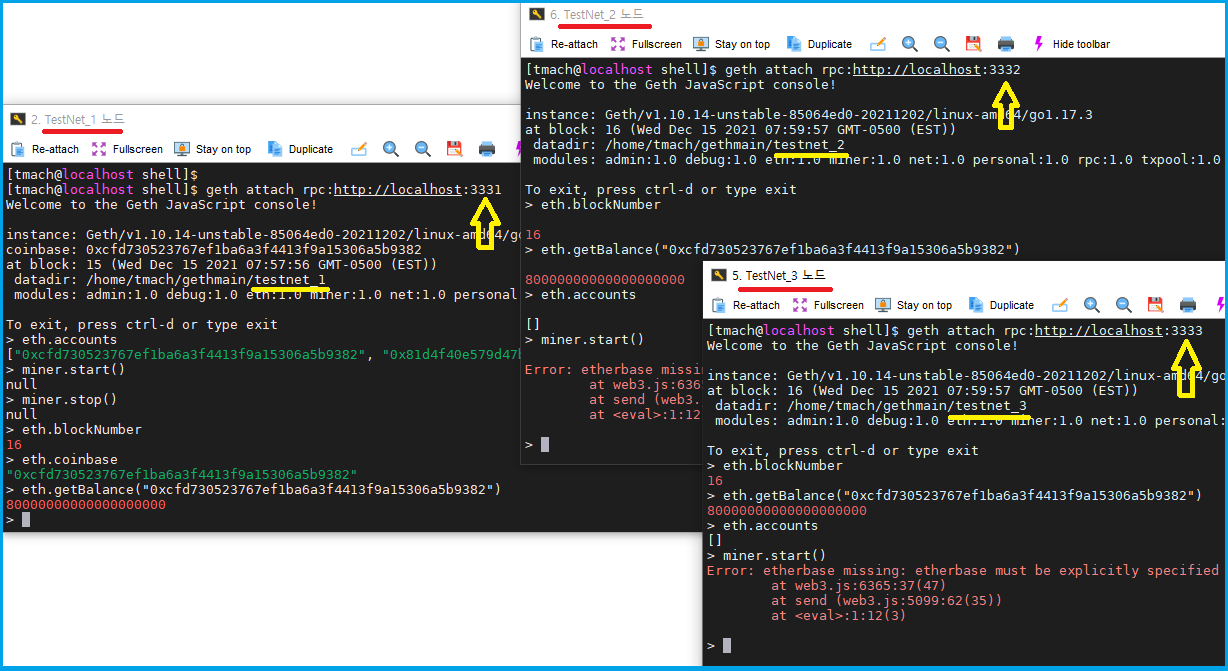 ◆ TestNet_1 [tmach@localhost shell]$ geth attach rpc:http://localhost:3331 Welcome to the Geth JavaScript console! instance: Geth/v1.10.14-unstable-85064ed0-20211202/linux-amd64/go1.17.3 coinbase: 0xcfd730523767ef1ba6a3f4413f9a15306a5b9382 at block: 15 (Wed Dec 15 2021 07:57:56 GMT-0500 (EST)) datadir: /home/tmach/gethmain/testnet_1 modules: admin:1.0 debug:1.0 eth:1.0 miner:1.0 net:1.0 personal:1.0 rpc:1.0 txpool:1.0 web3:1.0 To exit, press ctrl-d or type exit > eth.accounts ["0xcfd730523767ef1ba6a3f4413f9a15306a5b9382", "0x81d4f40e579d47b754e98f182f5e6cc05d6ba916"] > miner.start() null > miner.stop() null > eth.blockNumber 16 > eth.coinbase "0xcfd730523767ef1ba6a3f4413f9a15306a5b9382" > eth.getBalance("0xcfd730523767ef1ba6a3f4413f9a15306a5b9382") 80000000000000000000 > ▶ 16개 블록이 생성되었고 80ether가 지갑(0xcfd730523767ef1ba6a3f4413f9a15306a5b9382) 잔액으로 확인되네요. ◆ TestNet_2 [tmach@localhost shell]$ geth attach rpc:http://localhost:3332 Welcome to the Geth JavaScript console! instance: Geth/v1.10.14-unstable-85064ed0-20211202/linux-amd64/go1.17.3 at block: 16 (Wed Dec 15 2021 07:59:57 GMT-0500 (EST)) datadir: /home/tmach/gethmain/testnet_2 modules: admin:1.0 debug:1.0 eth:1.0 miner:1.0 net:1.0 personal:1.0 rpc:1.0 txpool:1.0 web3:1.0 To exit, press ctrl-d or type exit ♠ TestNet_2에서 block수를 체크하니 16개가 표시됩니다. > eth.blockNumber 16 ♠ TestNet_1 노드의 계정(지갑) 주소로 잔액을 확인하니 80ether가 확인되네요. > eth.getBalance("0xcfd730523767ef1ba6a3f4413f9a15306a5b9382") 80000000000000000000 ♠ TestNet_2에서는 계정(지갑)을 생성하지 않았기때문에 채굴이 불가능합니다. > eth.accounts [] > miner.start() Error: etherbase missing: etherbase must be explicitly specified at web3.js:6365:37(47) at send (web3.js:5099:62(35)) at <eval>:1:12(3) ◆ TestNet_3 [tmach@localhost shell]$ geth attach rpc:http://localhost:3333 Welcome to the Geth JavaScript console! instance: Geth/v1.10.14-unstable-85064ed0-20211202/linux-amd64/go1.17.3 at block: 16 (Wed Dec 15 2021 07:59:57 GMT-0500 (EST)) datadir: /home/tmach/gethmain/testnet_3 modules: admin:1.0 debug:1.0 eth:1.0 miner:1.0 net:1.0 personal:1.0 rpc:1.0 txpool:1.0 web3:1.0 To exit, press ctrl-d or type exit ♠ TestNet_3에서 block수를 체크하니 16개가 표시됩니다. > eth.blockNumber 16 ♠ TestNet_1 노드의 계정(지갑) 주소로 잔액을 확인하니 80ether가 확인되네요. > eth.getBalance("0xcfd730523767ef1ba6a3f4413f9a15306a5b9382") 80000000000000000000 ♠ TestNet_3에서는 계정(지갑)을 생성하지 않았기때문에 채굴이 불가능합니다. > eth.accounts [] > miner.start() Error: etherbase missing: etherbase must be explicitly specified at web3.js:6365:37(47) at send (web3.js:5099:62(35)) at <eval>:1:12(3) |