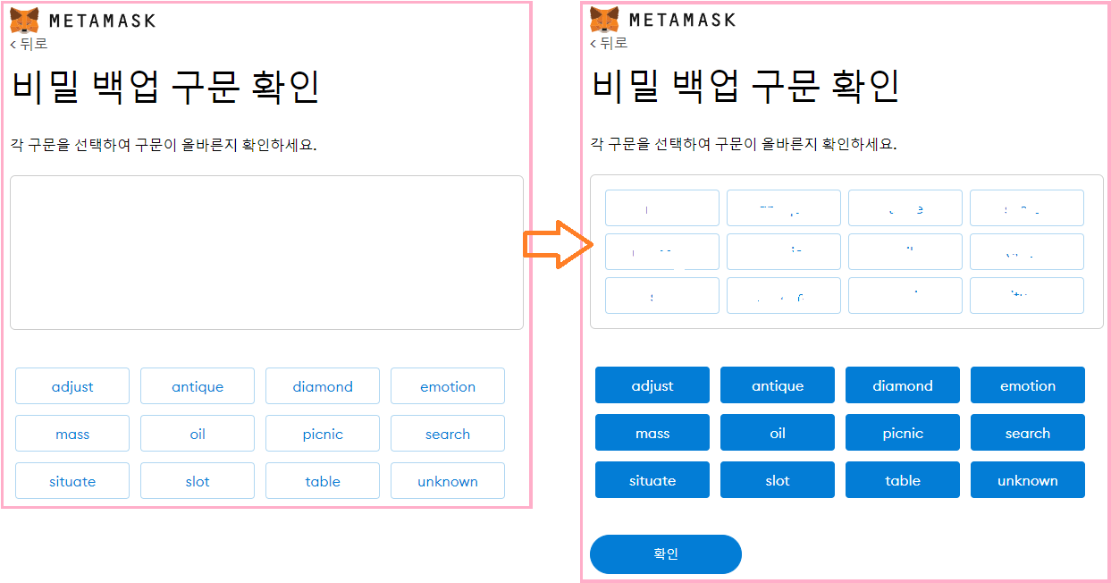 비밀 단어 12개를 순서대로 선택하시고 확인 클릭하세요.