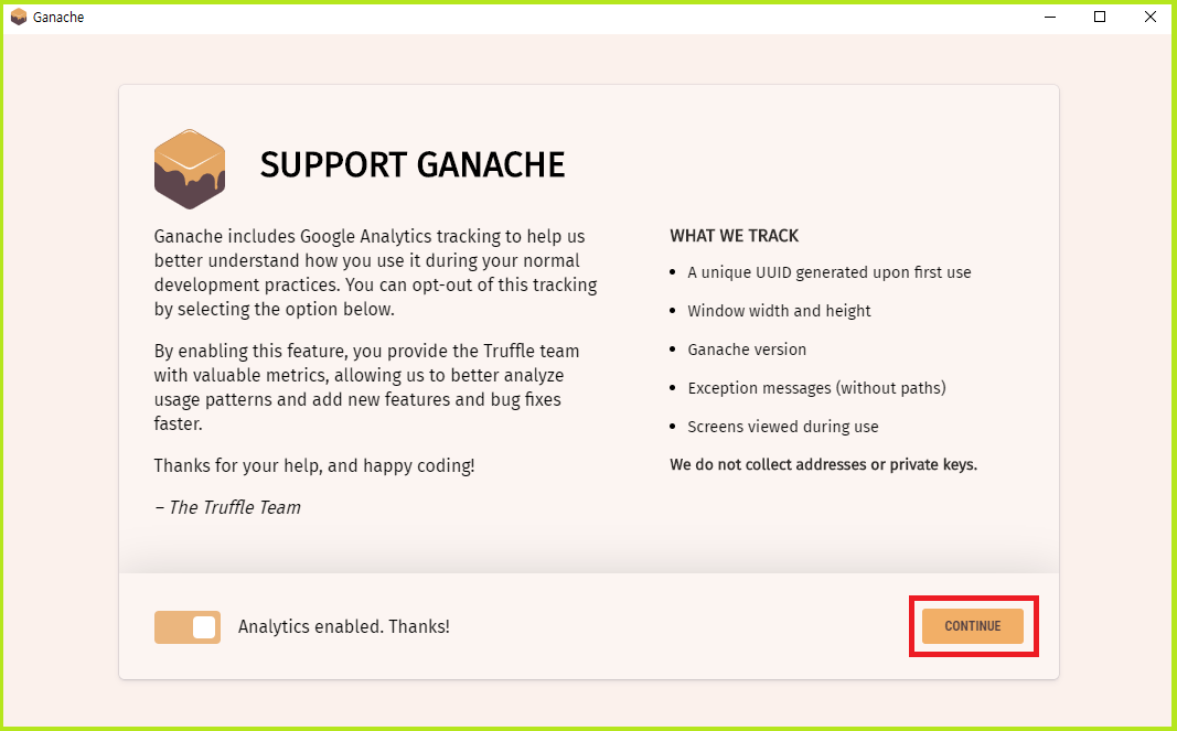 ganache에는 Google 애널리틱스 추적 기능이 포함되어 있어
