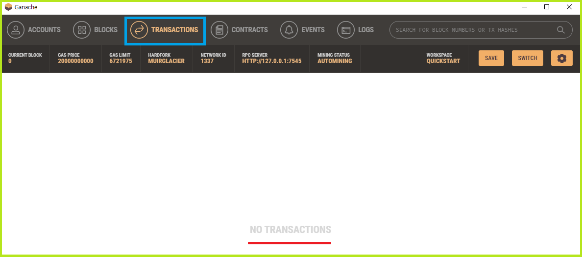 아직 트랜젝션이 없어 NO TRANSACTIONS가 표시되어 있네요.