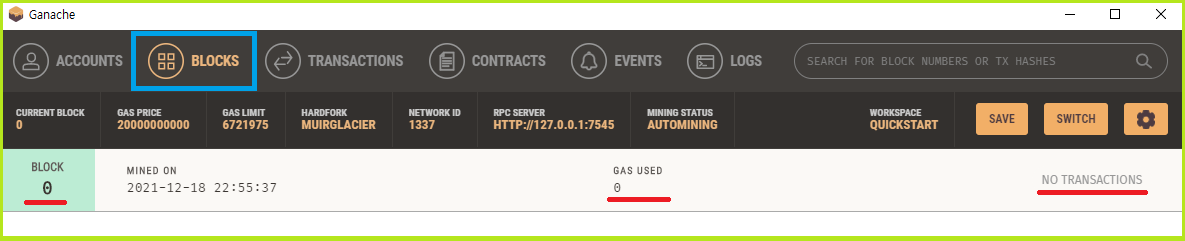 채굴을 통해 블록 생성되면서 블록 개수와 블록에 사용되는 GAS까지 표시합니다.