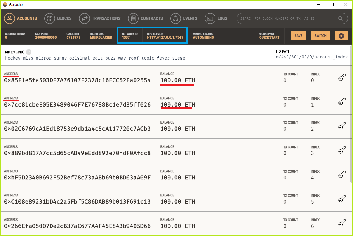 고맙게도 계정(지갑)이 10개 제공되고 각 지갑마다 100ETH씩 들어있어요.^^