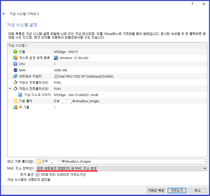 MAC 주소 정책(P)은 《모든 네트워크 어댑터의 새 MAC 주소 생성》 선택하세요.