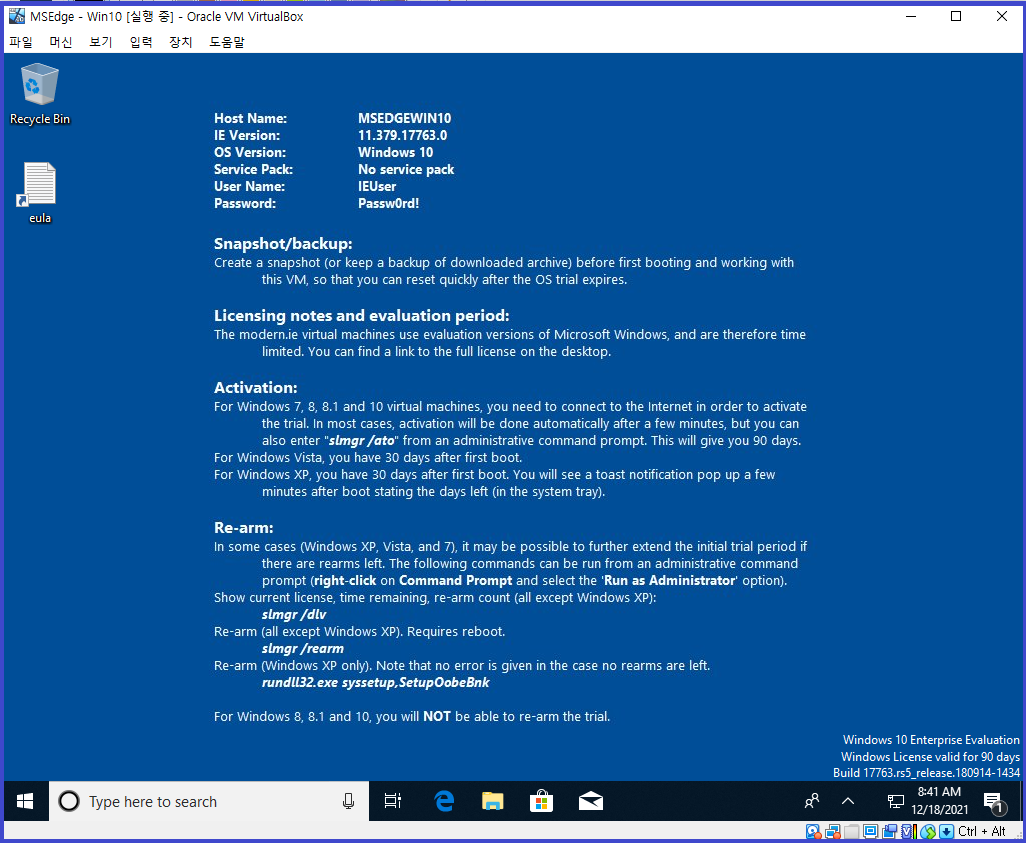 마이크로소프트에서 가상머신 파일 제공한다고 것을 알게 되었네요.
