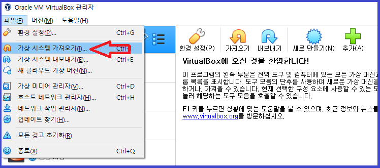 「파일」 메뉴에 「가상 시스템 가져오기」 선택하세요.