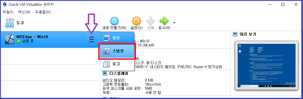 화살표 부분을 클릭하셔서 스냅샷 메뉴 클릭하세요.