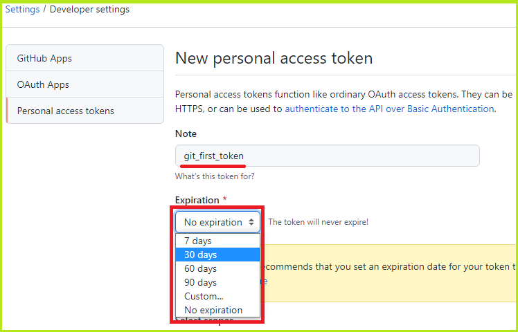 GitHub는 정보를 안전하게 유지하기 위해 토큰의 만료 날짜를