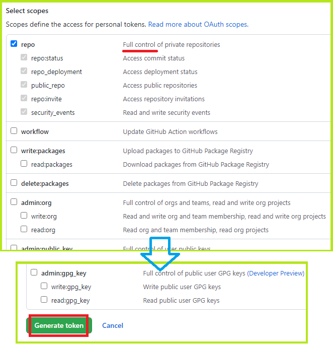 전체 제어(Full control)인 repo를 선택했습니다.