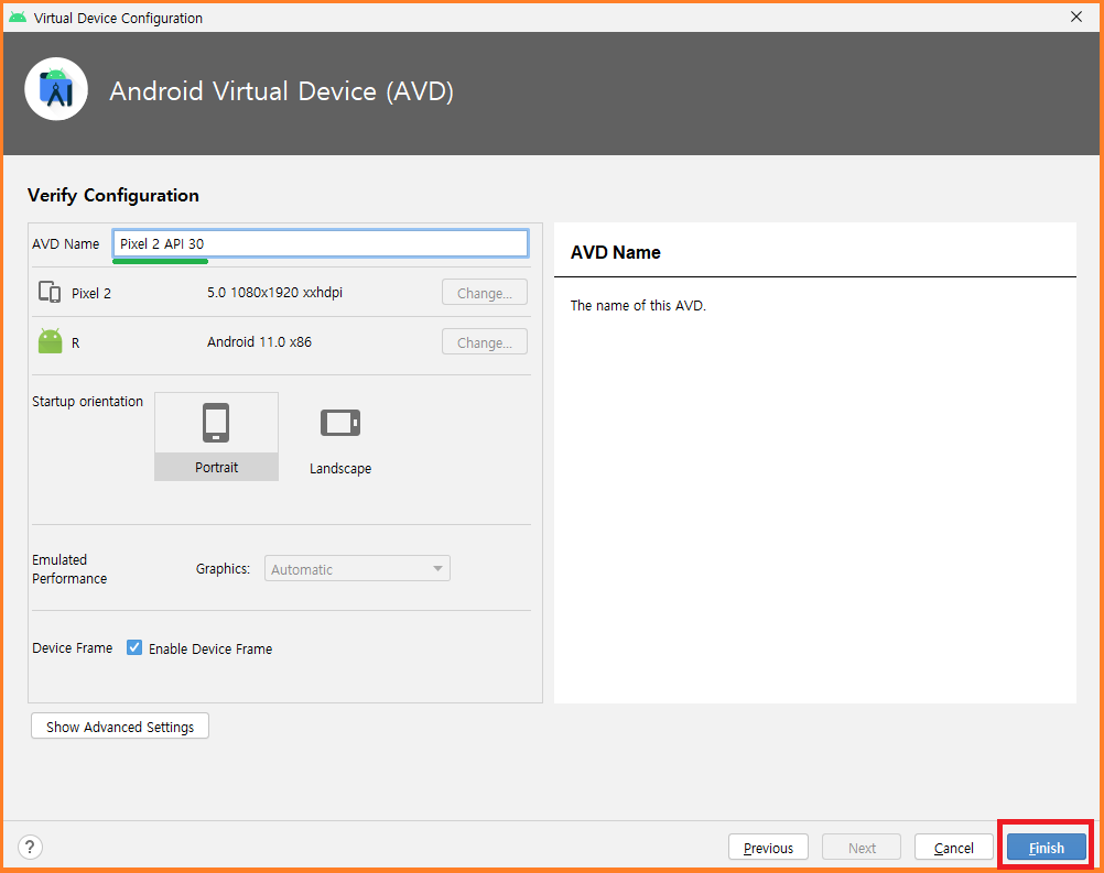 AVD Name은 기본값 그대로 쓰시거나 원하시는 이름으로 바꾸셔도 돼요.